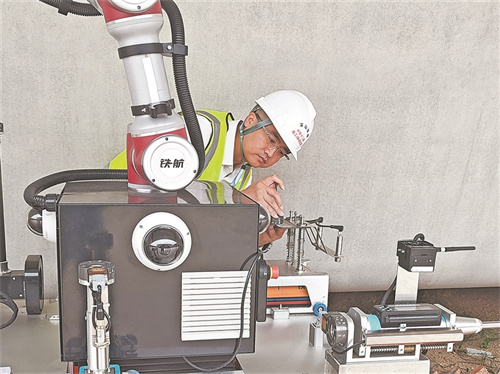 图为王可心在调试梁场机器人雷达工装转接装置。杨航宇 摄